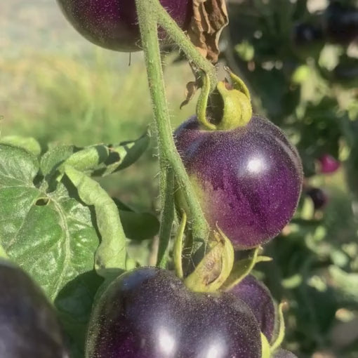 Cette tomate de type cocktail originaire des Etats-Unis fait de belle grappes de fruits bleus qui vont devenir plus rouge à la base en murissant. Sa chair est de couleur rouge rosé et est très savoureuse.