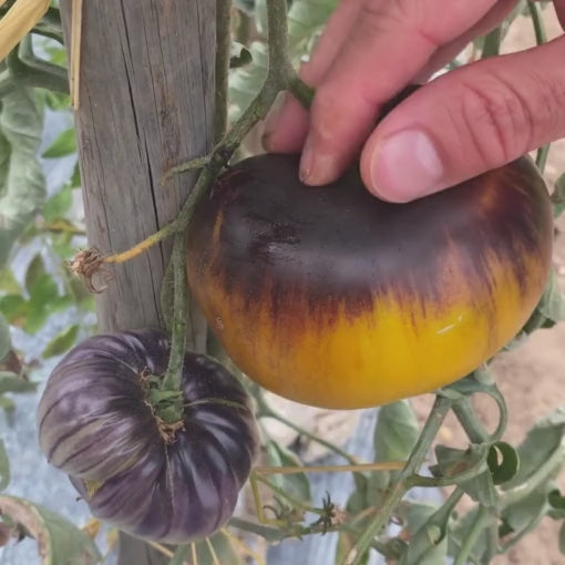 Très belle variété de Tomate à la robe jaune et strié de noir aux reflets violet. Vigoureuse, charnue, et très gouteuse, elle sera la super-héroïne de vos salades !!!